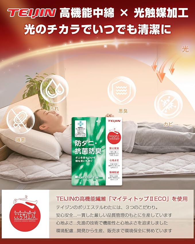 【TEIJIN高機能中綿を使用】TEIJINのマイティトップⅡは中綿そのものが「優れた防臭効果」と「防ダニ機能」を持っているので、湿気や寝汗などによる臭いを抑え、嫌なニオイの発生も防ぎます。洗濯後でもその効果が持続します。