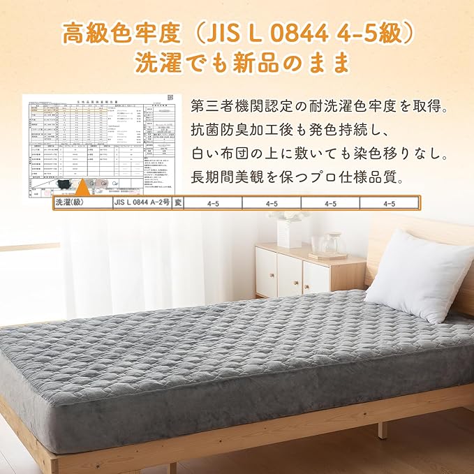 【高級色牢度(JIS L 0844 4〜5級)|洗濯しても新品のような美しさ】第三者機関による試験で、優れた耐洗濯色牢度(JIS L 0847 4〜5級)を取得。抗菌防臭加工を施しても発色が長持ちし、白い布団に敷いても色移りの心配がありません。長期間にわたって美しい見た目を保てる、プロ仕様の高品質モデルです。