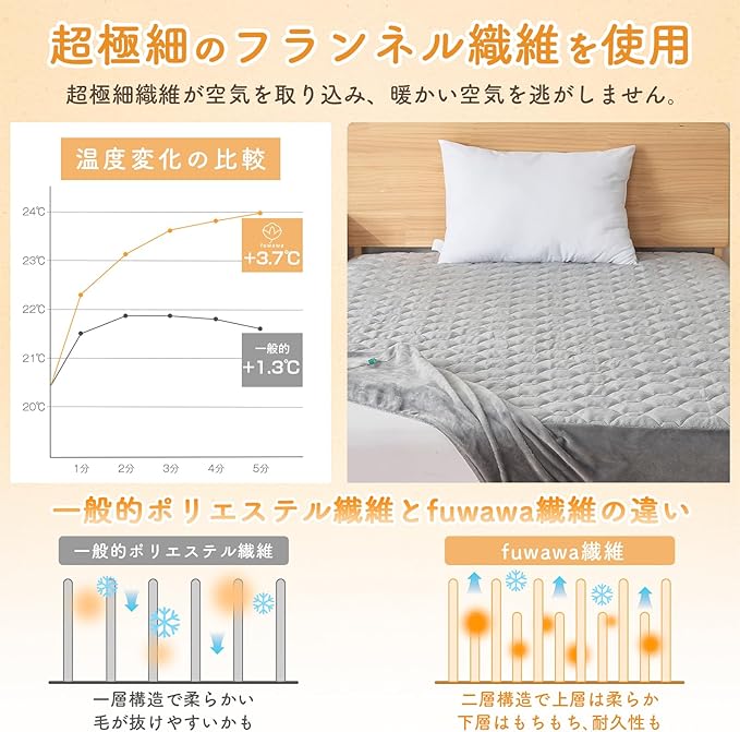 【保温・吸湿発熱 ベッドパッド180g/m 高密度ボアシーツ】長毛が体温をしっかり閉じ込め、短毛が断熱層を形成する特殊な二重構造。一般的な敷きパッド(約150g/m )よりも高密度で、冬の冷えが気になる方に最適です。敷くだけで布団の保温性を高め、マットレスカバーとしても使える多機能設計です。繊細な毛羽が空気の層を作り、吸湿発熱効果で寝はじめのひんやりした感触を素早く温もりに変えます。保温性に優れ、ながらも蒸れにくい通気性で、一晩中快適な温度をキープ。赤ちゃんからご年配の方まで、デリケートな肌にも優しくフィットします。