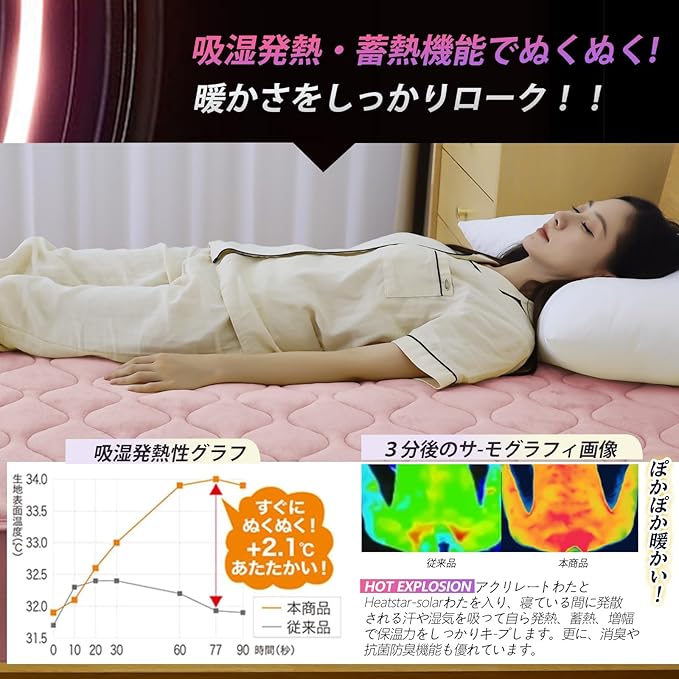 【5秒で瞬間吸湿発熱アクリレート】本品敷きパッドはHot Explosion高性能吸湿発熱アクリレート繊維を使用して、『超発熱性・高調湿性』を持っています。体から発散される湿気を吸収して熱に変え、体を温めると共に、睡眠環境の湿度を調整し、蒸れ感をしません。抗菌・消臭・静電気抑制の効果もあります。