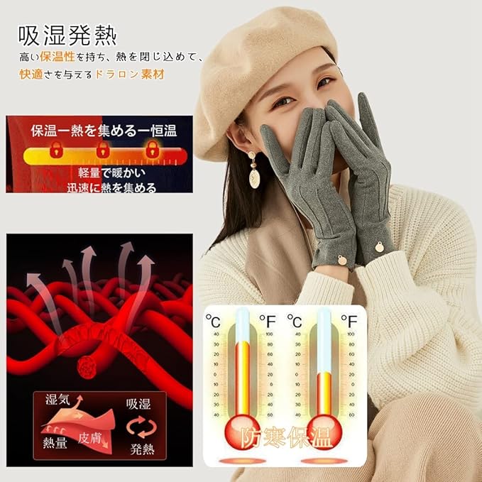 【2本指出し タッチパネル対応手袋】レディース防寒手袋の親指と人差し指の先端が開閉式で、手袋をつけたまま素手でタッチスクリーン操作できるので文字入力等細かな操作がストレスなくなります。「スマホは反応なし、操作できない」などの心配はまったくありません。寒い屋外でも暖かくキープしながらスマホで写真を撮ったり、コンパスを使ったりことができます。ファッション性と実用性を兼ね備えた防寒手袋です。
