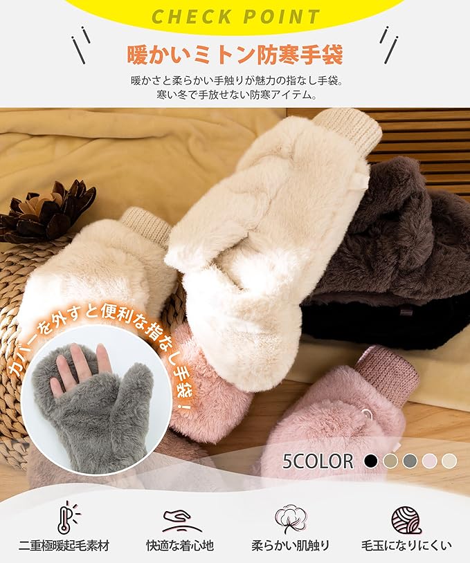 [YUMISS] 防寒手袋 レディース 【2WAY仕様・二重極暖起毛・厚手で上質な肌触り】 指なし フード付き ミトン手袋 柔らかい 可愛い 伸縮性 通勤 通学 自転車 プレゼント てぶくろ