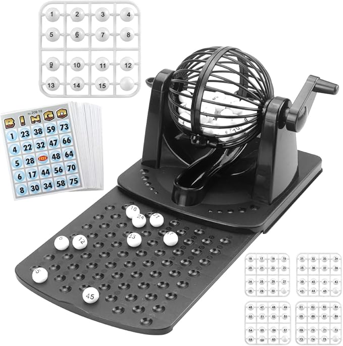 【セット内容】ボールトレイ付きビンゴマシーン 1点 ビンゴカード 20枚 数字ボール 75個(1~75の数字付き)【サイズ(約)】本体:34.5cm 18.5cm 16.5cm 【カラー】ブラック 【材質】プラスチック