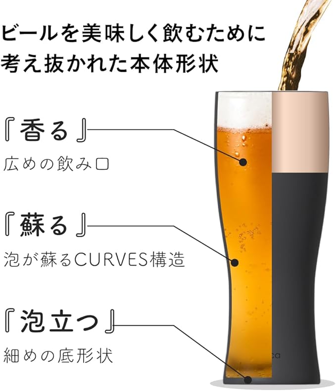 ビールを美味しく堪能できるようシェイプラインにこだわった「UCA 泡を楽しむタンブラー」真空2層断熱構造で、飲み頃温度をキープします。