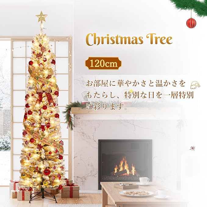 【省スペース設計】細身の鉛筆型デザインで、床面積を大幅に節約できます。限られたスペースや狭い場所でも、クリスマスの雰囲気を手軽に演出できます!(高さ120cm)