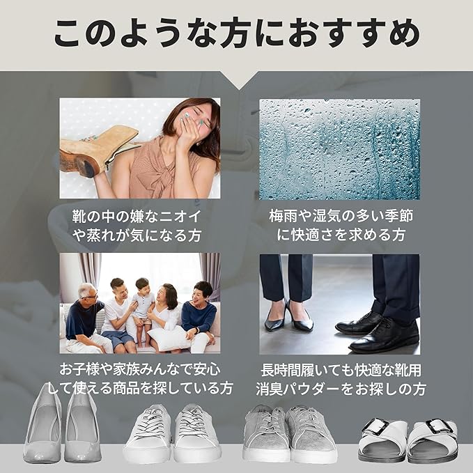 このような方におすすめ ・靴の中の嫌なニオイや蒸れが気になる方 ・梅雨や湿気の多い季節に快適さを求める方 ・お子様や家族みんなで安心して使える商品を探している方 ・長時間履いても快適な靴用消臭パウダーをお探しの方