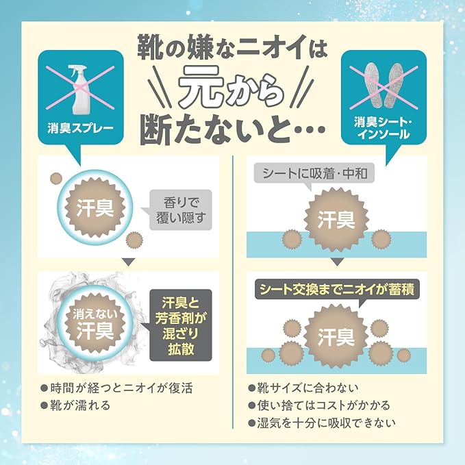 ✅【消臭・抗菌効果を第三者機関で分析試験済】足の臭いの原因となる、アンモニア臭や酢酸ガス、イソ吉草酸ガスの3大悪臭成分を最大99%カット!さらに消臭効果だけでなく、細菌の増殖を約80万分の1まで抑制できる抗菌効果も!強力な消臭・抗菌効果で臭いの元からブロックし、靴の匂い消しや足の臭い対策にしっかり効果を発揮します。
