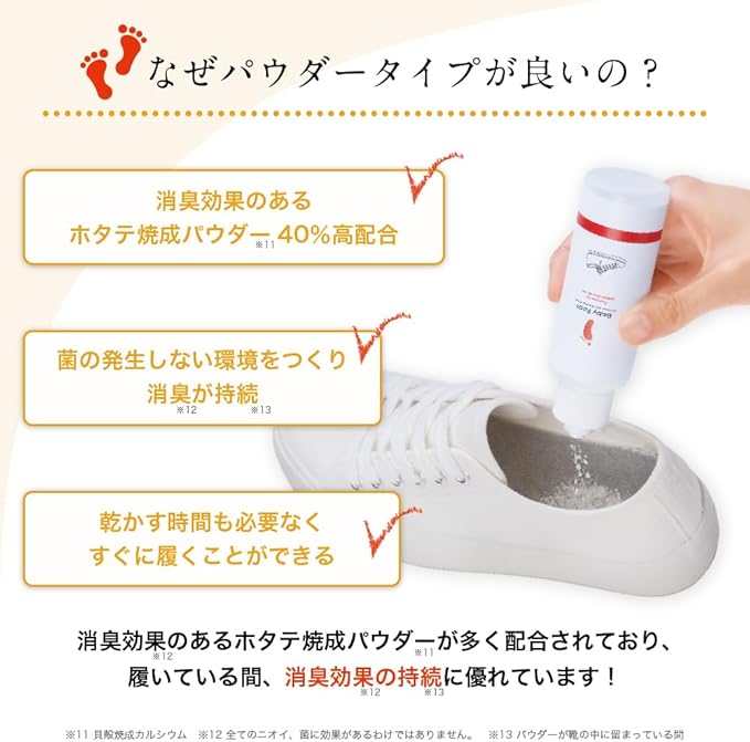 ①履くほどニオイが消える! パウダーと汗・水が混ざることでアルカリ性になりニオイ菌を除菌。汗が消臭効果を高める手助けをします。有効成分:ホタテパウダー ②1 回の使用で靴の三大悪臭を消臭! パウダーが靴の三大悪臭であるイソ吉酸、酢酸、アンモニアに働きかけて消臭をしてくれます。 ③靴全体を抗菌・防カビ加工! 抗菌効果で臭わない靴に。