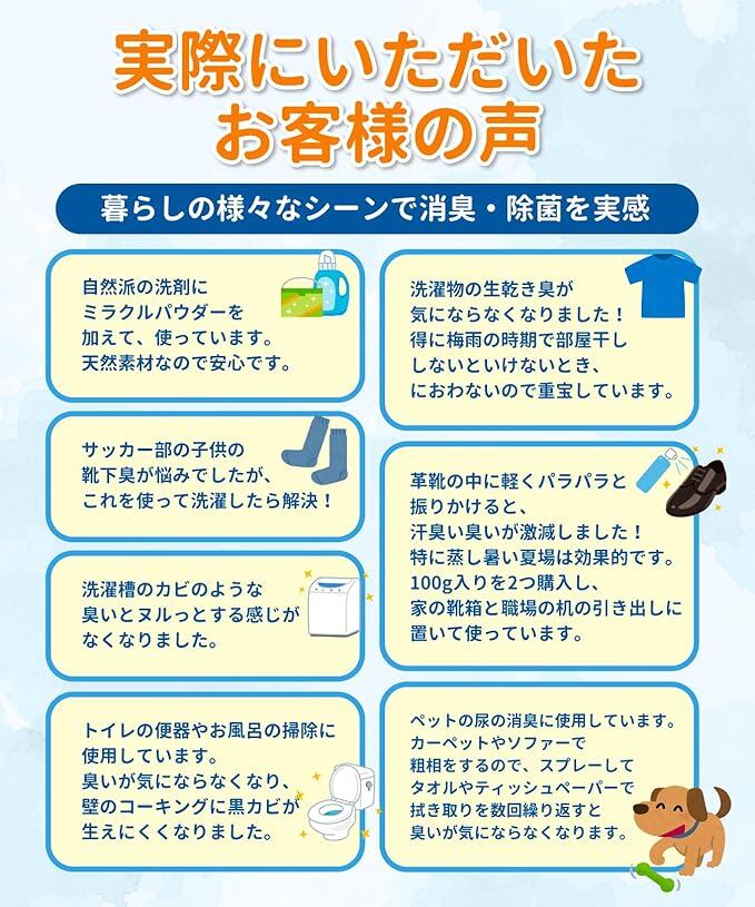 毎日触れるものだから、天然素材で除菌・消臭! 雑菌を根こそぎ除菌します。 気になるニオイを原因から消します。 25年以上の実績のある「ホタテ貝殻焼成パウダー02」をリニューアル! お客様の声をもとに、更に使いやすく進化しました。①たっぷりお得な600g、②使いやすい300g、③お試し/持ち運びに便利な100gをラインナップしました。 以前はごみとして廃棄されていたホタテ貝殻を、価値あるパウダーに変えました。ミラクルパウダーを使って頂くことは、持続可能な社会づくりに繋がります!