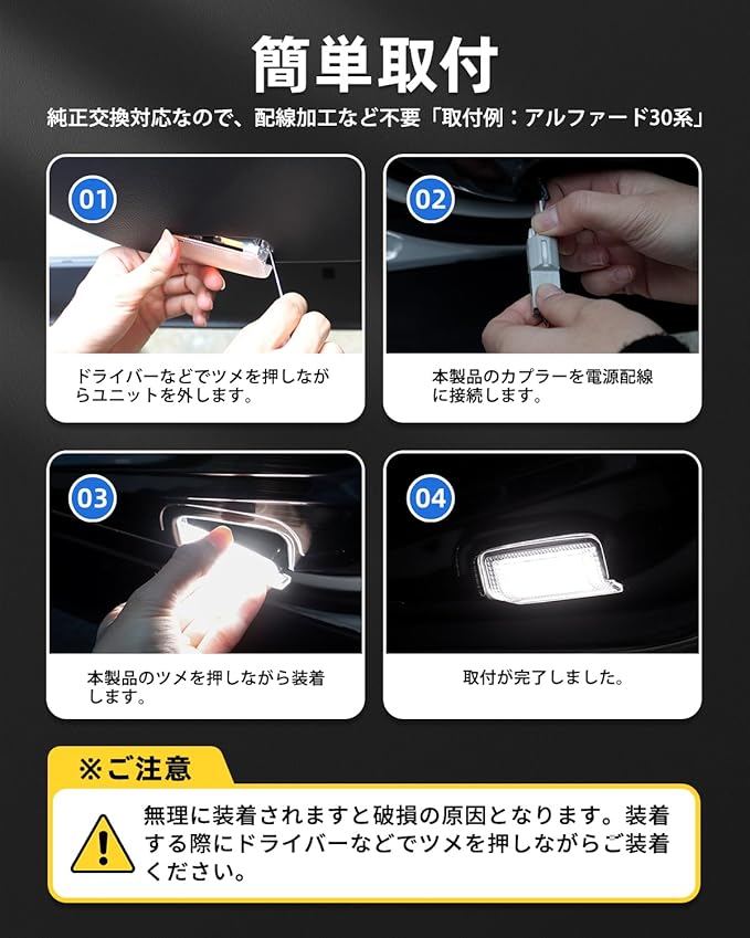 3.【車種専用設計】詳しい寸法データを取った上、純正カーテシランプユニット同形状になって、後付け感なくピッタリフィットします。ガラスクォーツレンズ高級感ある質感と光の拡散性を高める同時に、ドレスアップ性も抜群です。お車の雰囲気に馴染み、最高のフィッティングを体感してください。