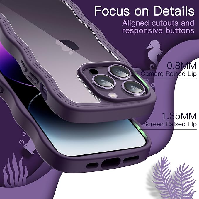 JETech iPhone 14 Pro 6.1インチ用 かわいい ケース 波状フレーム うねうね 耐衝撃 スマホカバー 女性用 女子向け クリア ハードPCバック (ディープパープル)