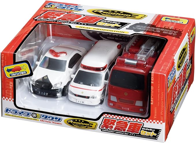 ドライブタウンは、子どもの手にフィットするほどよいサイズのプルバックカー。デフォルメ・ボディは実車のリアル感を損なわないベストバランス。ハイクオリティな塗装でコレクションにも最適。パトカー・救急車・消防車のセット。
