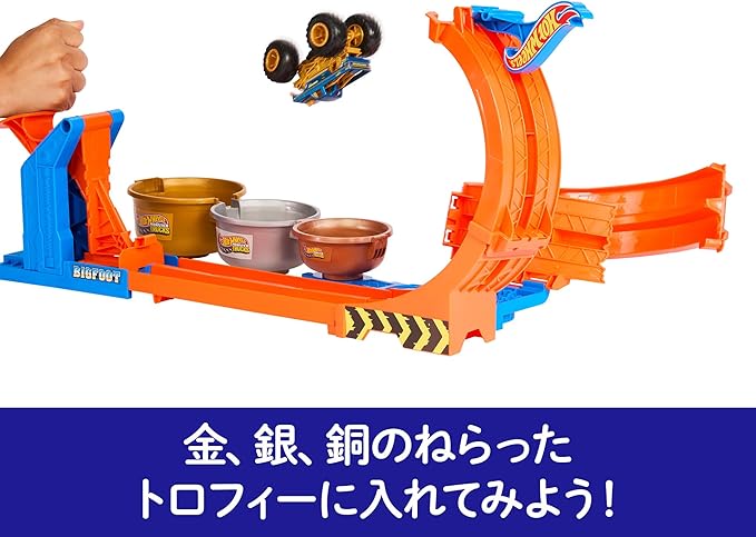 【内容】トロフィーカップを目指してジャンプ!モンスタートラックのビッグフットをループさせ、金、銀、銅のどのトロフィーを獲得できるか!?