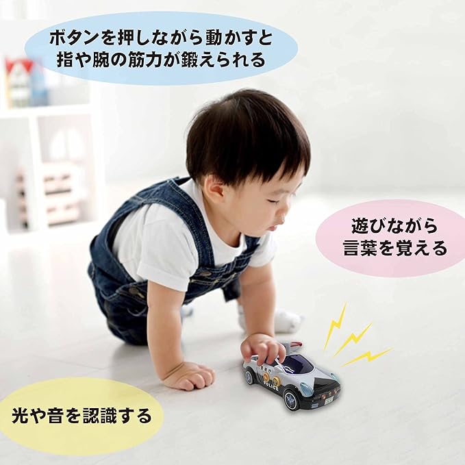 【遊んで学べるおもちゃ】可動式のタイヤなので手を使ってパトカーを動かすことができます。ボタンを押しながら車を動かしたり、悪い奴を捕まえるお巡りさんごっこをする事で、自然と脳や手の筋肉を使い、子どもの育成に役立ちます。遊ぶことでたくさん学べるおもちゃです。