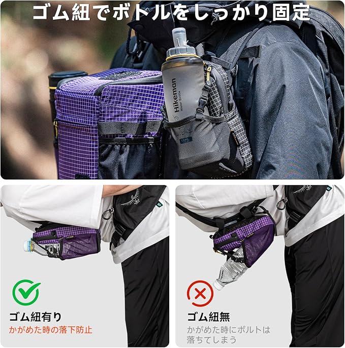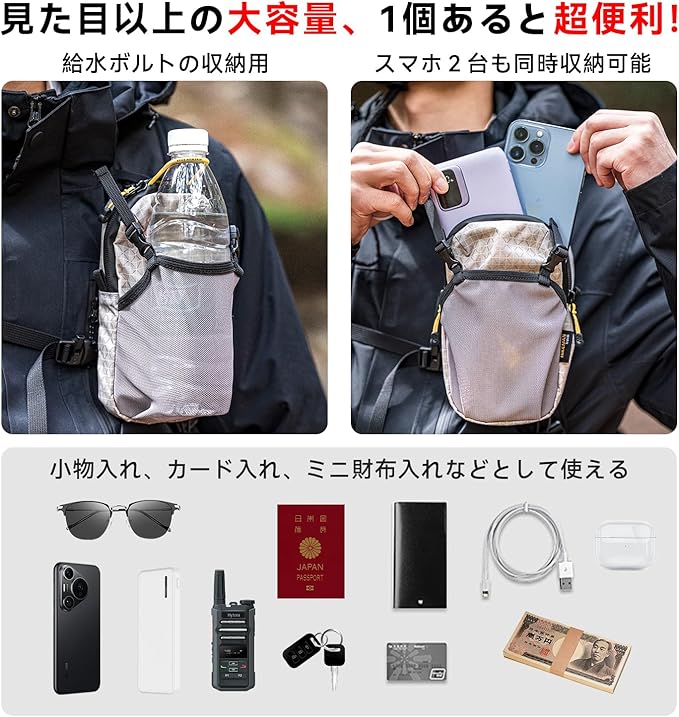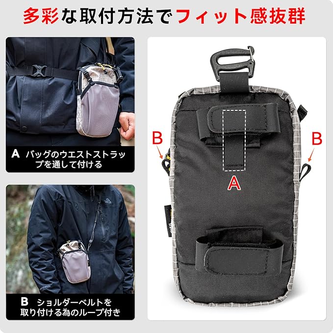 「多機能ポーチ」:財布、サングラスなどの小物入れとしてバックパックで出かける時、すぐ使う小物の取り出しが楽になる。ボルトを固定できるゴム付き、かがめた時でも落ちる心配がなく、登山やハイキングの際のボルトポーチとしても使えます。