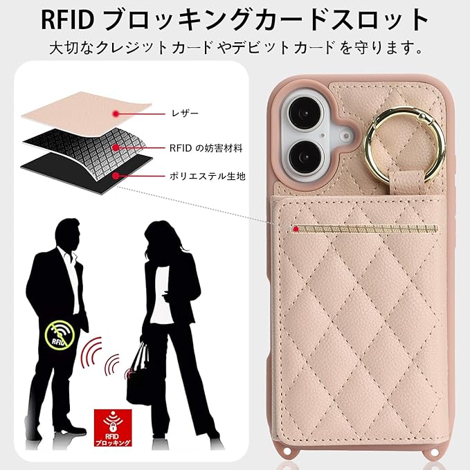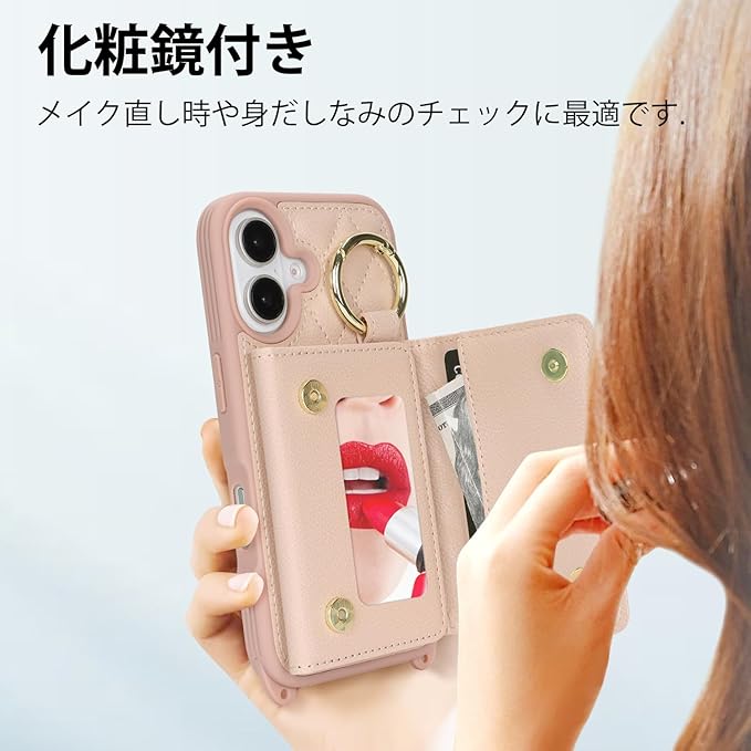 対応 iPhone 16 ケース ショルダー いphone16 ケース カード収納 鏡 肩掛け 斜めかけ スマホショルダー アイフォン16 ストラップ付き 耐衝撃 調節可能な 携帯ケース - ローズゴールド