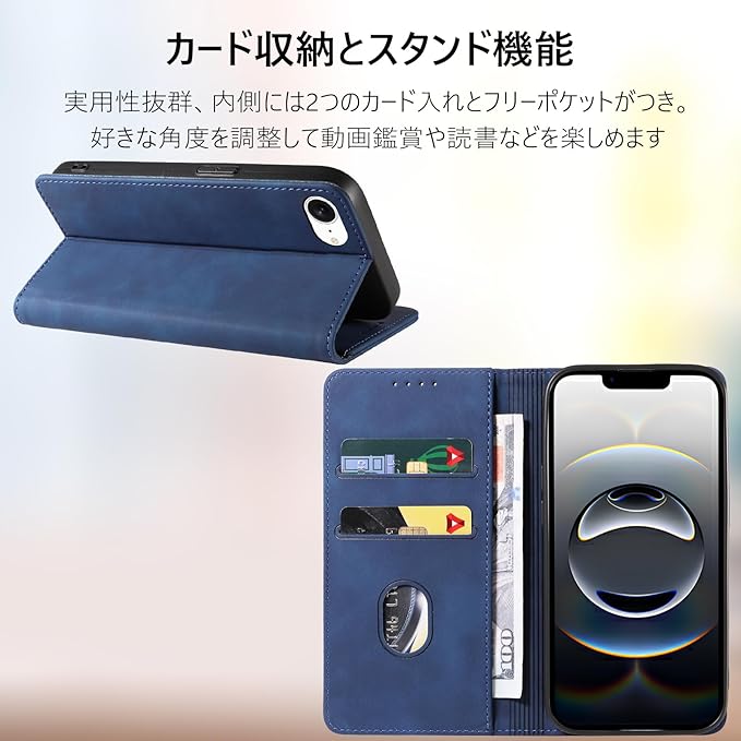 【カード収納とスタンド機能】アイフォン16e カバー動画視聴に便利なスタンド機能が付き、横向いて斜めに立てて、お好きな角度を調整でき、両手が解放され、お気軽に読書やビデオの観賞を楽しむことができます。内側には2つのカード入れとフリーポケットがつき、名刺や定期券の収納に優れているアイフォン 16eケースです