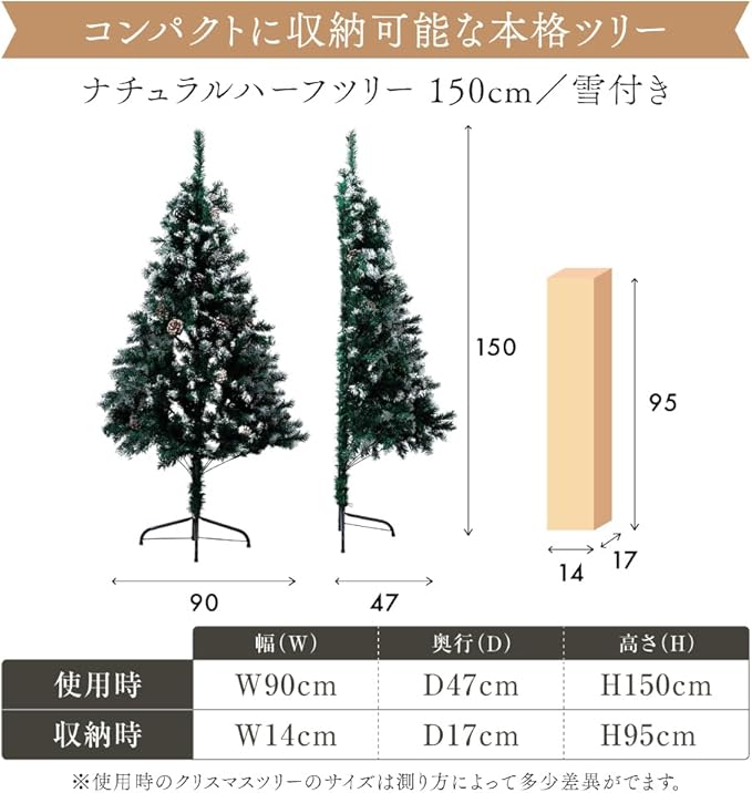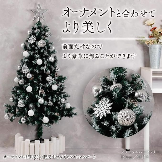 【 商品の仕様について 】内容量:クリスマスツリー上部、下部、土台、ねじ。 ハーフツリーのサイズは120㎝&150㎝。カラーバリエーションは松かさ&雪タイプの2種類。松ぼっくりは本物を使用しております。