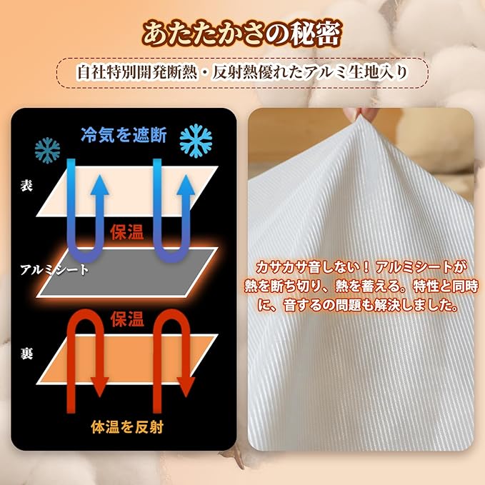 【音しないアルミシート入三層構造の軽さ+暖かさ】掛け布団カバーの表地をアルミ生地と共に縫製、熱を逃さず保温性優れ、外からの冷気を断熱するこだわりのデザインです。アルミがガサガサ音しない独自の新開発素材です。暖かい空気をたくさんロック、やさしく体を包んでくれる快適な掛け布団カバーです。