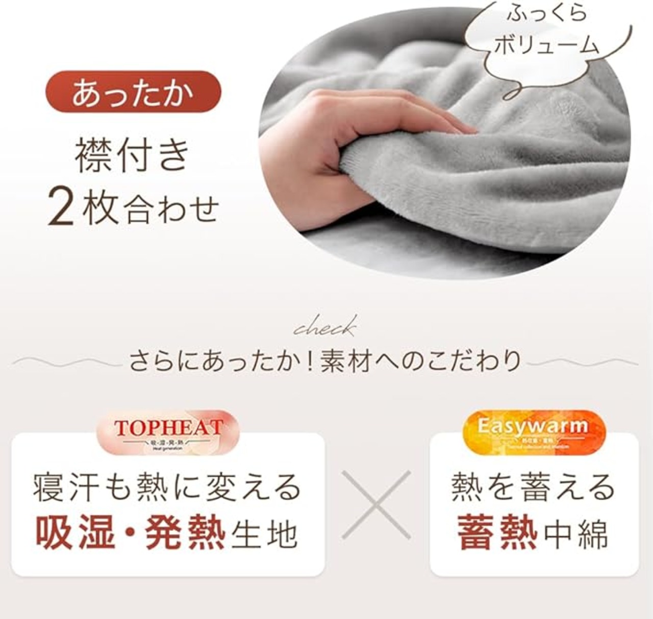 【スタッフのおすすめポイント!】 ・ボリュームのある2枚合わせ ・首元まであたたかい襟付き ・じんわりあったか「吸湿発熱」生地 ・保温力UP「蓄熱中綿」入り ・とろけるような手触り 超高密度フランネル生地 ・肌乾燥や静電気を防ぐしっとり高保湿の椿オイル加工 ・お子様にも安心の低ホルムアルデヒド ・世界基準の安全性 エコテックス認証 ・いつでも清潔 抗菌・防臭加工 ・洗濯機で丸洗いOK ・ISO9001認可工場での生産