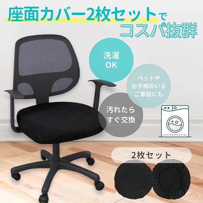 【2枚セット】 椅子カバー チェアカバー 座面カバー 洗える 伸縮素材 通気性 オフィスチェア ダイニングチェア 取り付け簡単 丸洗い可能 日本国内検品 (ブラック)