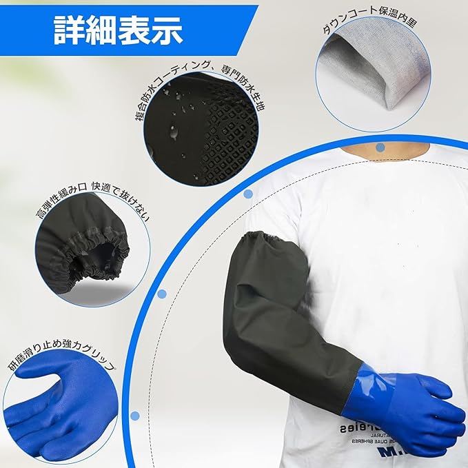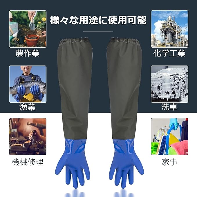 【長袖70cm】仕様:全長約70cm、手幅約12cm、数量:2双入 素材:天然ゴム腕全体をカバーする約70cmのロング設計。袖口から水が入る心配がありません。2足セットなので、取り替えながら長くお使いいただけ、大変お得です。
