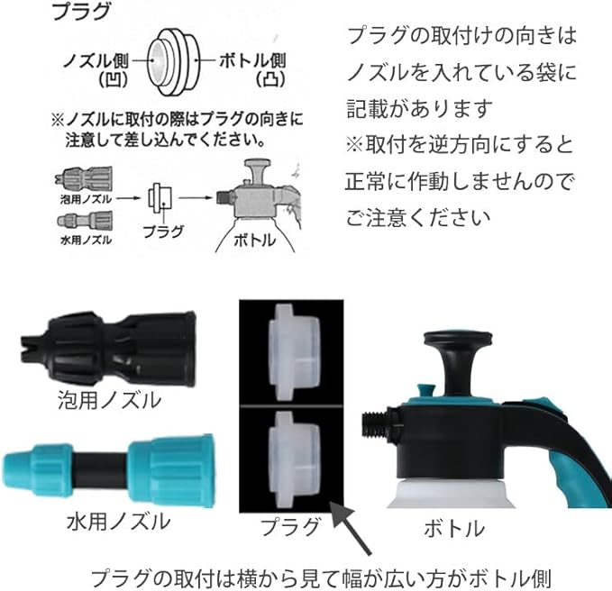 【使用上のご注意】※液体洗浄剤は必ず水溶性の液体をご使用ください。※粘度の高い液体はノズル詰まりの原因となります。※液体洗浄剤は発泡性(泡立ちの良い)のあるものをご使用ください。発泡性の無い液体洗浄剤は泡にして噴射することはできません。※使用後は直ちにリリースバルブ(空気抜き)を引いて、ボトル内の圧力を抜いてください。※破裂する恐れがありますので、蓄圧した状態のまま放置しないでください。