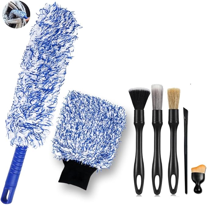 【自動車整備士推薦 7種類 7本セットの洗車ブラシ】:✅【ソフトブラシ】: 柔らかいブラシを使用すると、傷を効果的に防ぐことができます。✅【ミディアムブラシ】: 豚毛ブラシ。主に車のロゴ、車のグリル、ヘッドライトの隙間、車体の隙間などのやや硬い部分の清掃に使用されます。✅【ハードブラシ】: ハードの洗車ブラシで狭い隙間や強固な汚れに最適なブラシ。✅【マイクロブラシ】:車のエンブレム、レター、ヘッドライトの隙間、車体の隙間など汚れをピンポイントで除去できます。✅【ソフトブラシ車内用】主にエアコンの出口、ハンドルの隙間、シートの隙間、革の表面などに使用できます。✅【ホイール専用ブラシ】平たい芯にモフモフした埃取りが被せてあります。平たく曲がる埃取りは、洗濯機の下の掃除に便利です。ホイールブラシだけど、洗面所に使うと便利でした。✅【極細繊維グローブ・洗車傷を最小限に】特に柔らかいマイクロファイバー洗車ミットは良質な混合超微細繊維から作られ、柔らかく、清潔効率が高い。汚れをしっかり絡め取りながらも、車の塗装面の傷を防ぐことができます。