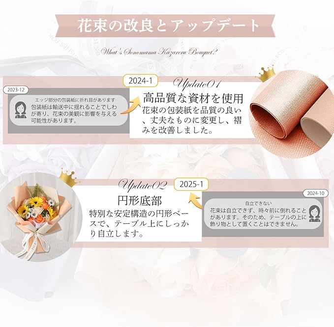② ソープフラワーが選ばれる理由:1.手入れ不要で枯れない!長く美しさを楽しめます。2.プリザーブドフラワーよりボリュームたっぷり。3.鮮やかな色彩と優しい石鹸の香りで癒されます。4.花粉がないため、アレルギーの心配が不要。5.見た目も香りも楽しめる理想のフラワーギフト。