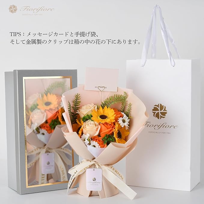 ③ ギフトボックス付きで贈り物に最適:専用ギフトボックス&手提げ袋付きで、すぐにお渡し可能。しっかりしたボックスで高級感を演出し、無料のメッセージカードも付属。花束サイズ:約32 16 9cm、総重量:約520gと、ボリューム感たっぷりの華やかなプレゼントです。