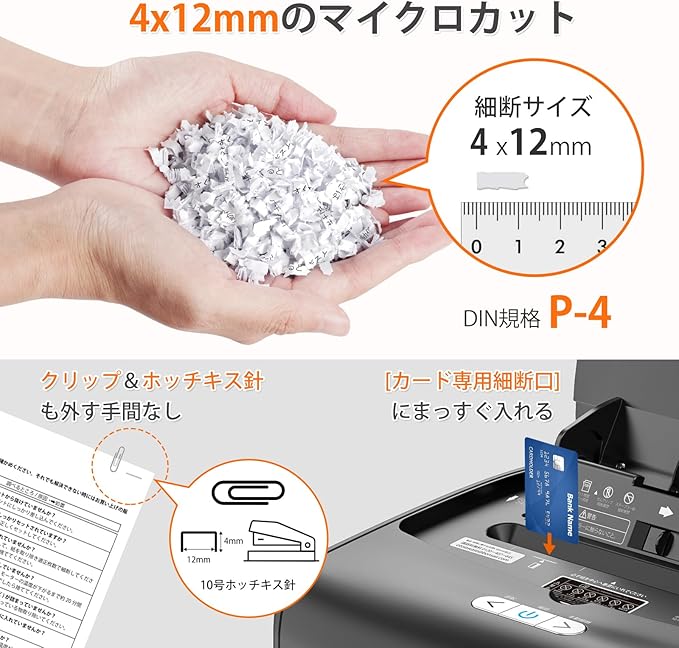 【全自動&高セキュリティ細密細断】A4用紙最大100枚(64g/㎡)の一括投入が可能。機密書類に最適な4 12mmのマイクロカットで、請求書やカード類も確実に細断。業務効率と情報保護を両立します。※手差しの場合:一度に最大10枚細断、約10分間連続細断