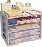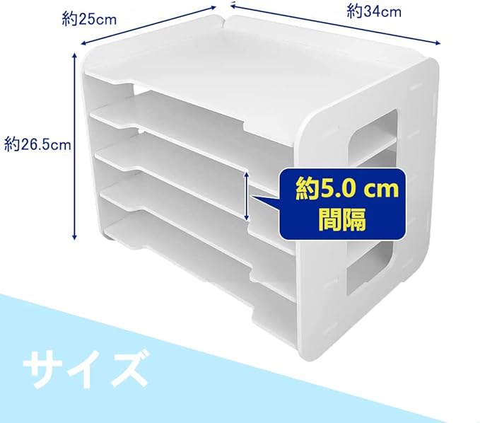 【卓上書類ケース】多機能:A4サイズ対応、大容量の卓上収納 ラック。収納力が良い卓上収納ラックです。5段の仕切りデザインで、大きいな物品から小物まできれいにおしゃれに収納できます。手紙やA4用紙、書類、ファイル、フォルダーなどのオフィスでの収納に最適です。