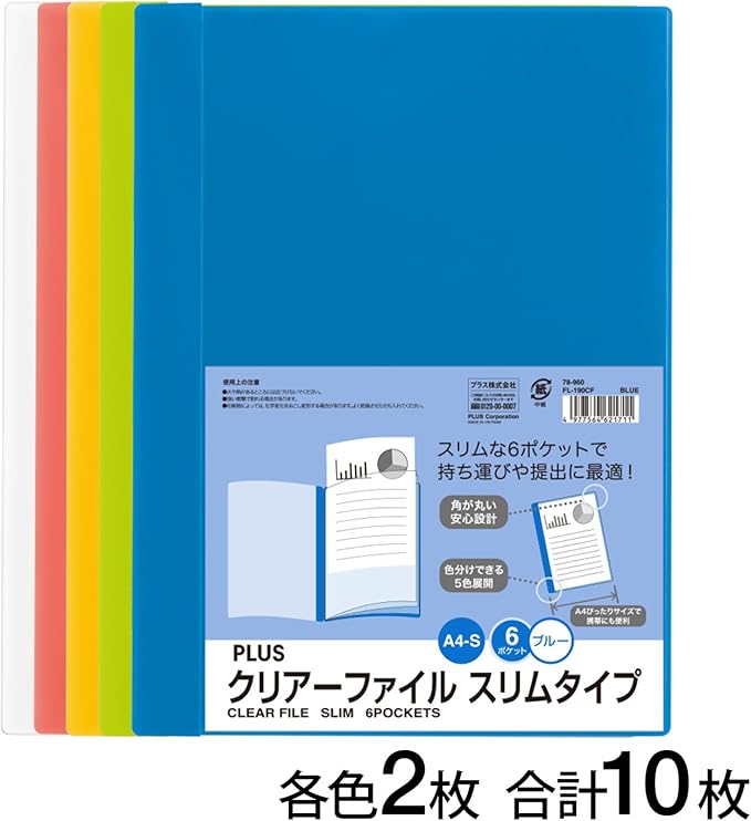 プラス クリアファイル A4 スリムタイプ 6P 5色込 10冊パック FL-190CF