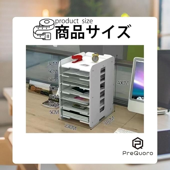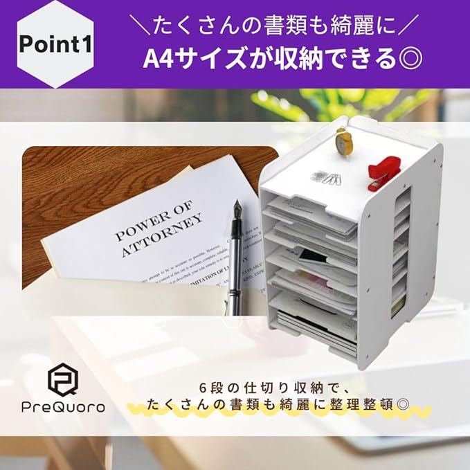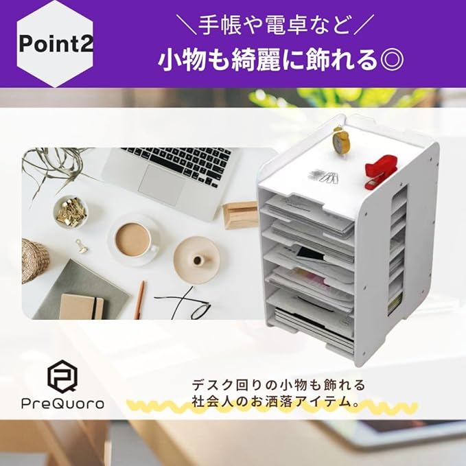 【机の上が変われば、仕事もはかどる】PreQruooの組み立て式ファイルスタンドは、机上収納や卓上ラックとして書類分類に最適。引き出しなしのスリム設計で、限られたスペースを有効活用。おしゃれな事務用品として、オフィス収納にも書斎にも馴染み、省スペース収納で整理整頓がラクになる便利アイテムです。
