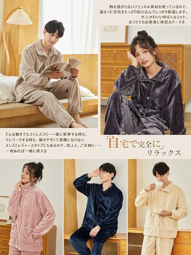 【2way襟~寒さから全方位の遮断】暖かくてふわふわのパジャマが登場!2way襟のデザインで、トップスとパンツのツーポイント。やや厚手だが暖かいこのパジャマは、肌に優しい毛足の長いフリース裏地を使用しているので、毛布やブランケットをまとっているような暖かさ。シンプルなデザインで、男女、カップル、夫婦・・・どちらでも使え、サイズはM~XL、カラーは5色から選べるので、きっと自分に合った1枚が見つかるはず。