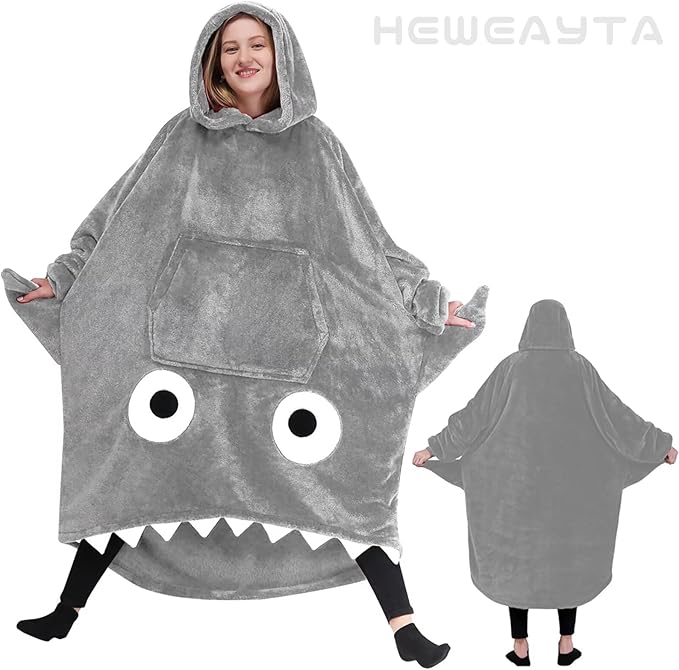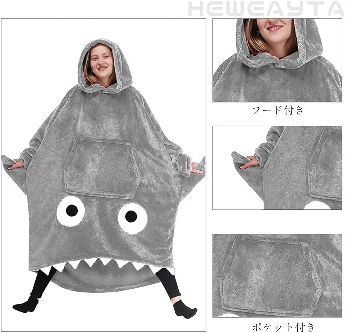 [HEWEAYTA] 着る毛布 ルームウェア レディース 冬 - 着るブランケット 厚手 フード付き 長袖 ロング丈 ポケット付き もこもこ サメ 男女兼用 暖かい