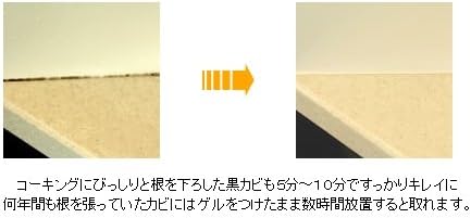 【使用法と効果】ゲルを密着させるために施工面にかかった水分を充分に拭き取っておきます。換気をよくし施工面にゲルを塗布し密着させます。汚れが落ちたら水洗いします。ピンポイントで圧倒的なカビ取り効果が期待できます。カビ取り作業がグーンと楽しくなります。