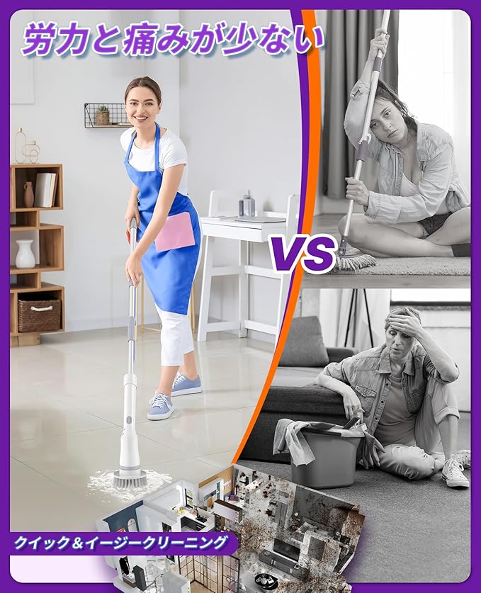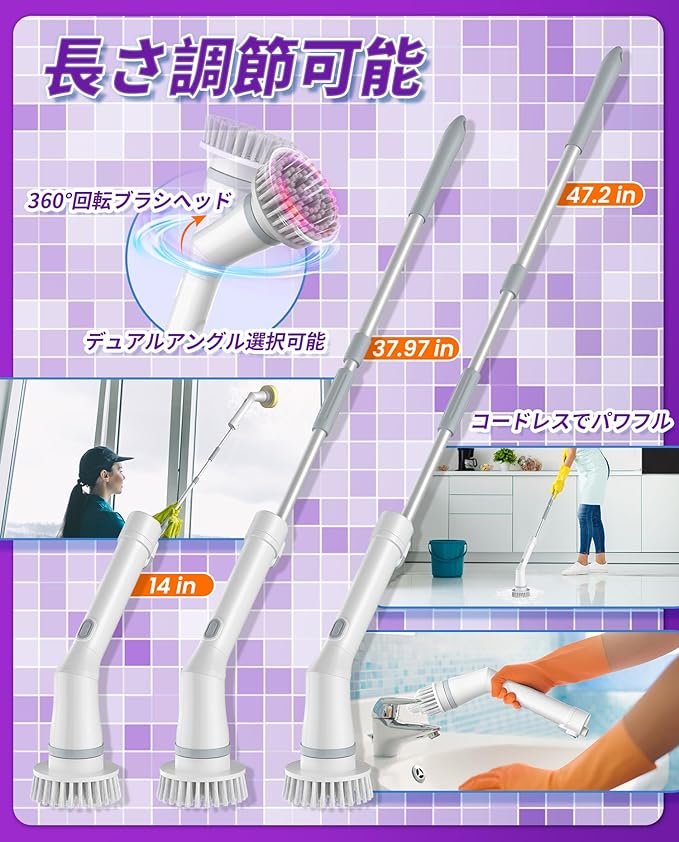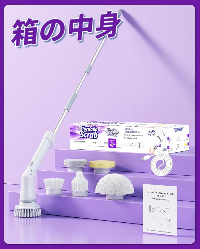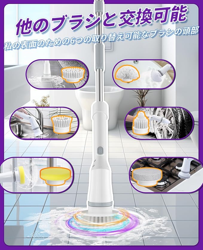 バスポリッシャー 電動お掃除ブラシ 6つ取り替えブラシ付き お風呂掃除 ターボプロ ブラシ USB C充電式 長さ伸縮可能 手持ち式 3000mAh大容量 120分間連続使用 風呂 浴室 浴槽磨き トイレ掃除 床 窓 壁 玄関 車の掃除 年末掃除 PSE認証済み 日本語説明書付属