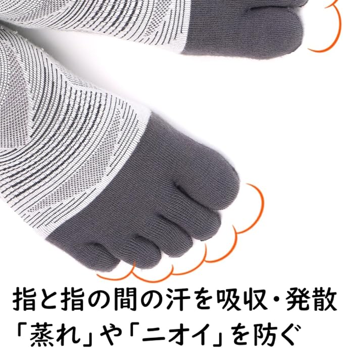 五本指ソックスは指が1本1本の生地で覆われているので、一般的なスポーツソックスより吸汗性に優れており、ムレにくいので、快適さもアップ。