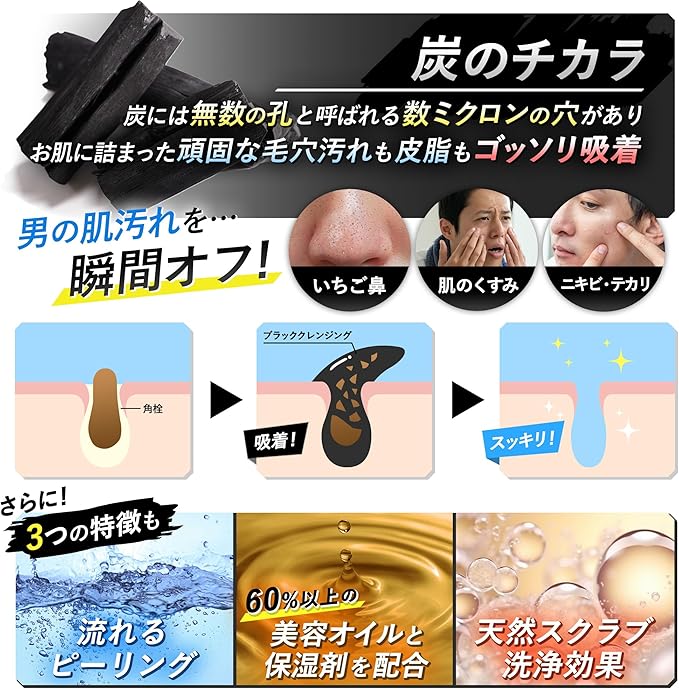【1本3役の炭洗顔 多機能クレンジング】「クレンジング」「スクラブ」「ピーリング」潤しながら洗える多機能クレンジングアイテム。炭のチカラで毛穴汚れや角栓をごっそり吸着。古い角質を取り除きうるつや肌へ。60%以上の美容オイルと保湿成分配合。炭の吸着でふんわり優しいスクラブ洗浄効果。水に流すと汚れの見える化でキレイを実感。毛穴の黒ずみ汚れ、くすみ、ザラツキをしっかりオフ!簡単つるつる肌へ。