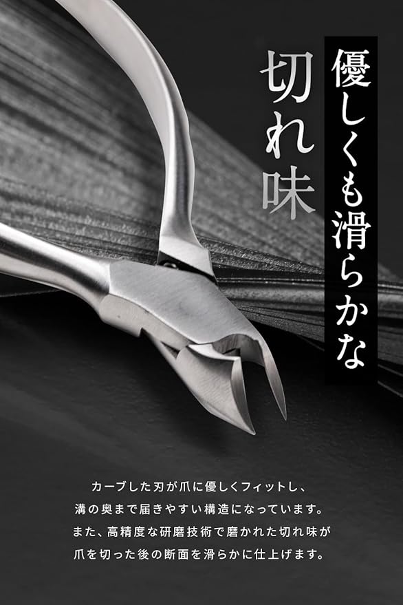 【ニッパー爪切りとは?】「硬い爪」「厚い爪」「巻き爪」に適した爪切りです。そのため、通常は「足の爪」に使用されます。工具のニッパーのようにてこの力を利用し、小さい力で切りやすいように工夫されております。通常の爪切りでは切りにくい爪の端にも届き、細かく切ることができます。
