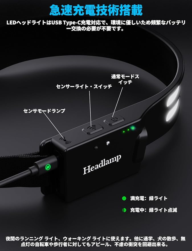 【安全性&2年間保証】また、2年間のHOT保証付きますので、ご安心ください。パッケージ内容:ヘッドライト*1個、USB充電ケーブル*1個、取扱説明書。