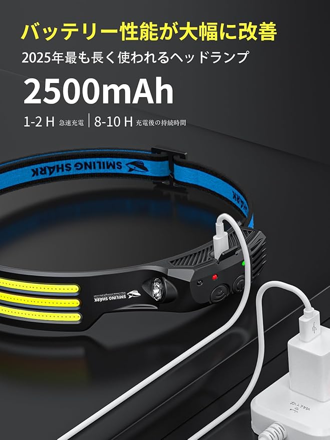 【超長時間連続使用】ヘッドランプは2500mAhのバッテリーで作動し、1回の充電で最大8時間の連続使用が可能。フル充電にかかる時間はわずか1~2時間です。(初回使用前に充電が必要)