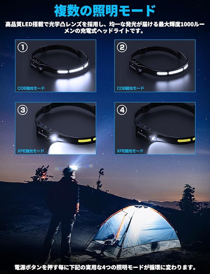 【4種の点灯モード】へっどらいとは4種の点灯モードを提供:集光高輝度,集光低輝度,散光高輝度,散光低輝度。