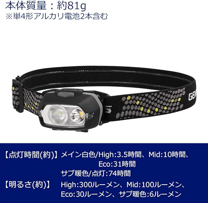 明るさ:High/300ルーメン・Mid/100ルーメン・Eco/30ルーメン、サブ暖色LED/6ルーメン、使用電池:単4形アルカリ電池 2本