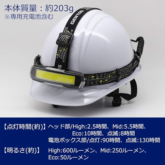 実用点灯:ヘッド部(High/2.5時間、Mid/5.5時間、Eco/10時間、点滅/8時間)、電池ボックス部(点灯/90時間、点滅/130時間)