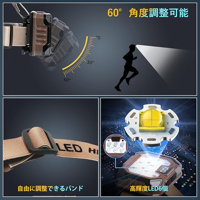 【軽量&フィット感】約129gの重さです。肌にやさしいソフト素材の伸縮式ヘッドバンドを採用し、夜釣りなどの場合は長時間装着しても首にストレスを与えません。ヘッドライトが60 の角度を自由に調整でき、使用環境に応じて適切な照射角度や範囲を調整して危険を回避できます。