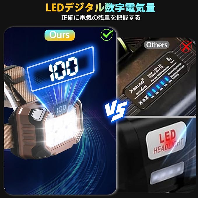 【2000mAh大容量・LED残量表示】2000mAhの大容量バッテリーを内蔵した充電式 ヘッドライトです。ハイモードは連続点灯時間約3H、エコモードは連続点灯時間約15Hです。また、このヘッドランプは電池残量を本体正面のディスプレイに表示されて、充電するタイミングをより把握しやすくなり、アウトドアに突然バッテリー切れの心配はありません。