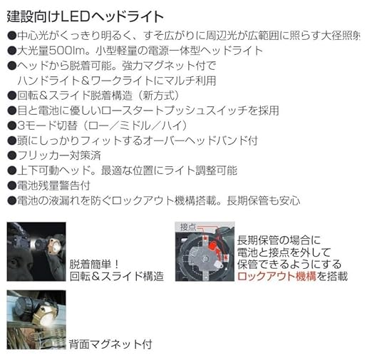 特徴 アジャスタブルライトモード, 上下可動ヘッド。最適な位置にライト調整可能, 目と電池に優しいローモードスタート照射採用, 電池容量が減ったら点滅でお知らせする電池残量警告付, 頭にしっかりフィットするオーバーヘッドバンド付アジャスタブルライトモード, 上下可動ヘッド。最適な位置にライト調整可能, 目と電池に優しいローモードスタート照射採… 表示を増やす