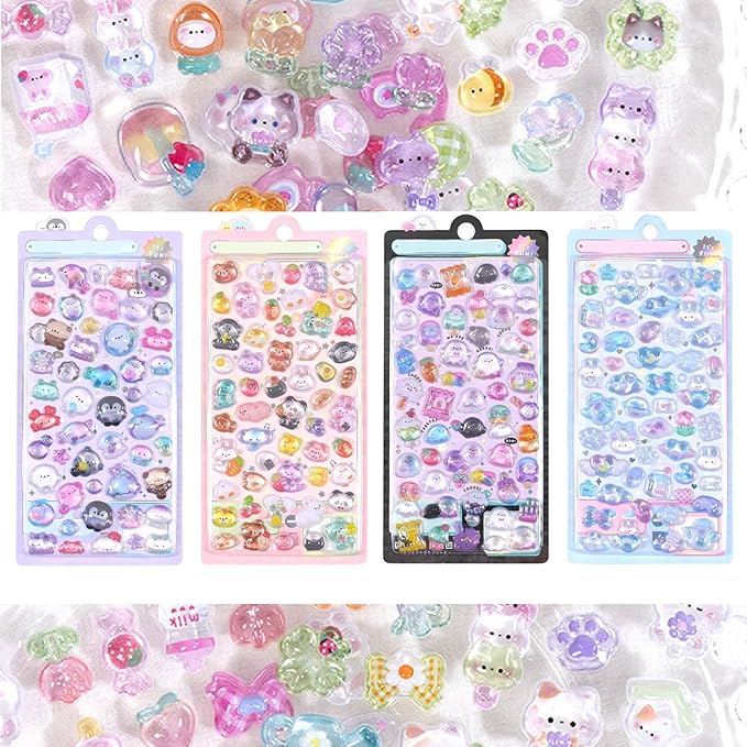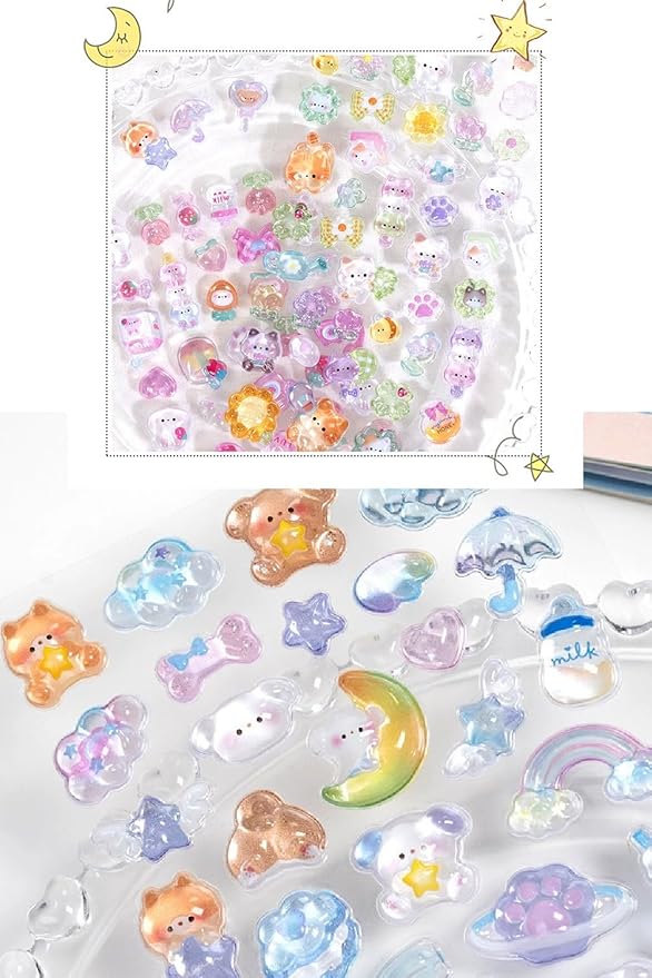 豊富なデザイン: 可愛い動物やスイーツをモチーフにした立体シールが。淡いパステルカラーとキラキラ光るエポキシ樹脂が女の子に大人気。